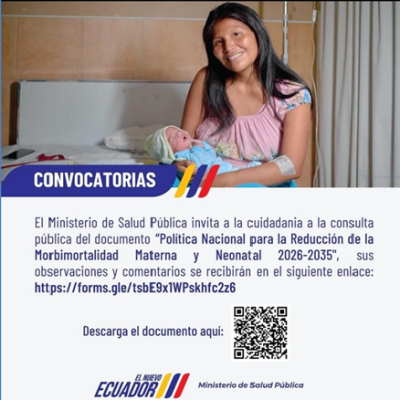 Descripción: El Ministerio de Salud Pública del Ecuador ha avanzado en el proceso de construir la Política Nacional para la Reducción de la Morbi-Mortalidad Materna y Neonatal 2026 -2035, y hace un llamado a la comunidad profesional y ciudadanía a enviar comentarios y observaciones al borrador final de dicho documento,